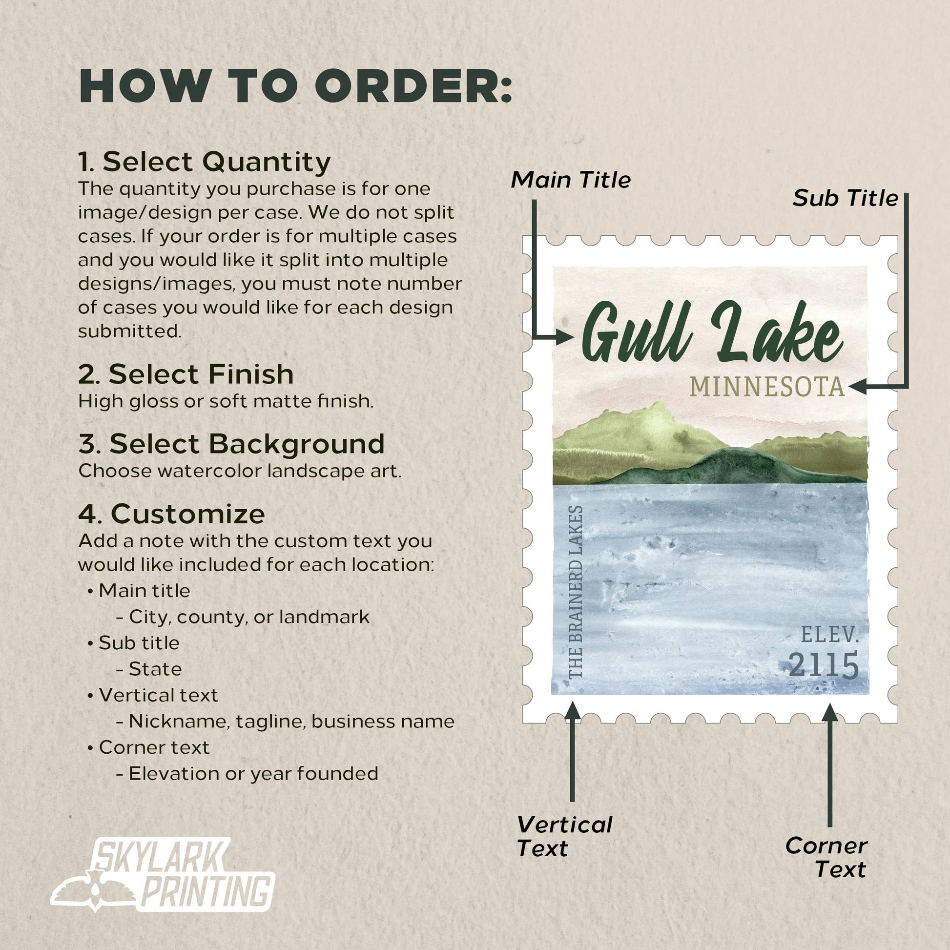 Customize with your city, state and text to make the perfect souvenir sticker that represents your town, county, or business. These stickers are cut out to a unique postage stamp shape that is sure to stand out. Beautiful watercolor art captures the magic of various landscapes across the country. Sticker size is 2.3" x 3".