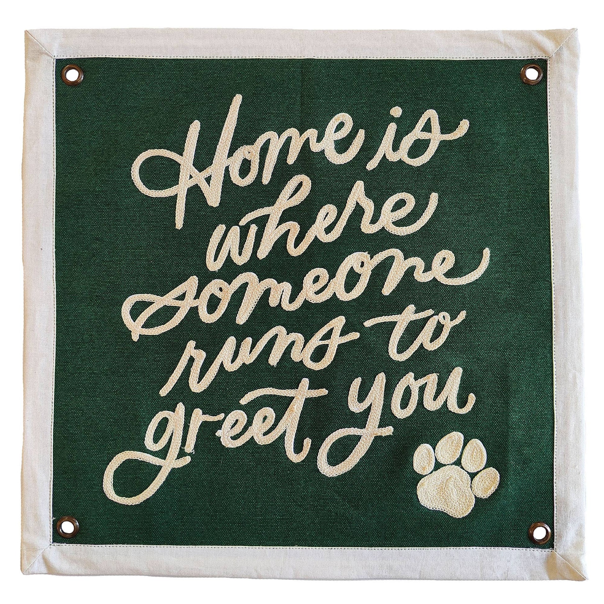 Celebrate the unconditional love of dogs with our Home is Where Someone Runs to Greet You Canvas Banner. This heartwarming sentiment captures the joy of being welcomed by your furry friend, making it a perfect addition to any pet lover’s home. The design features chain-stitched embroidery, adding a personal, timeless touch.