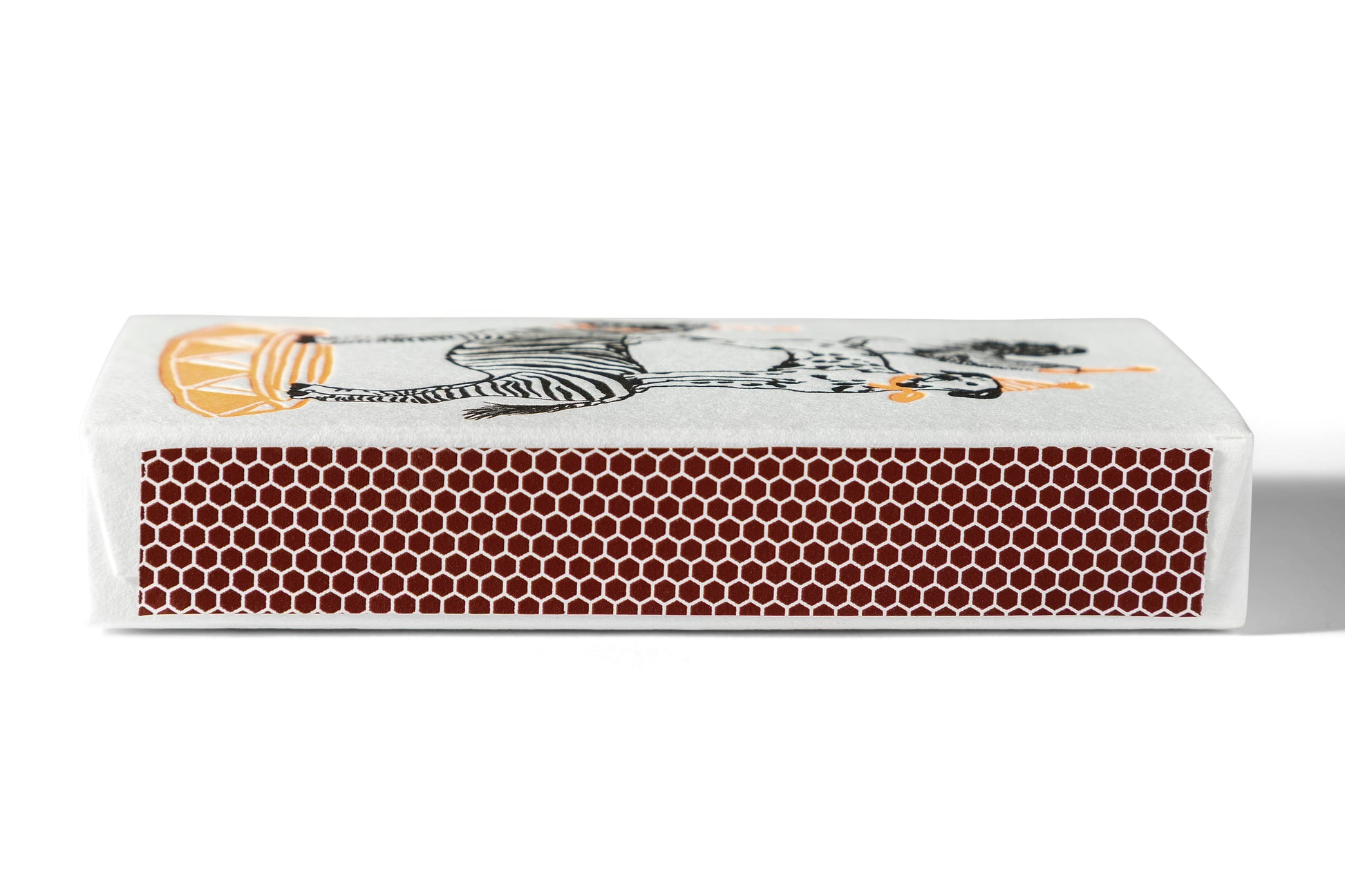 A zebra, a dalmatian, & a rooster walk into a party… & they’re all wearing hats. This matchbox brings the fun with a whimsical animal stack, complete with birthday flair. Letterpress printed in crisp black and bright orange, it’s a guaranteed conversation starter.