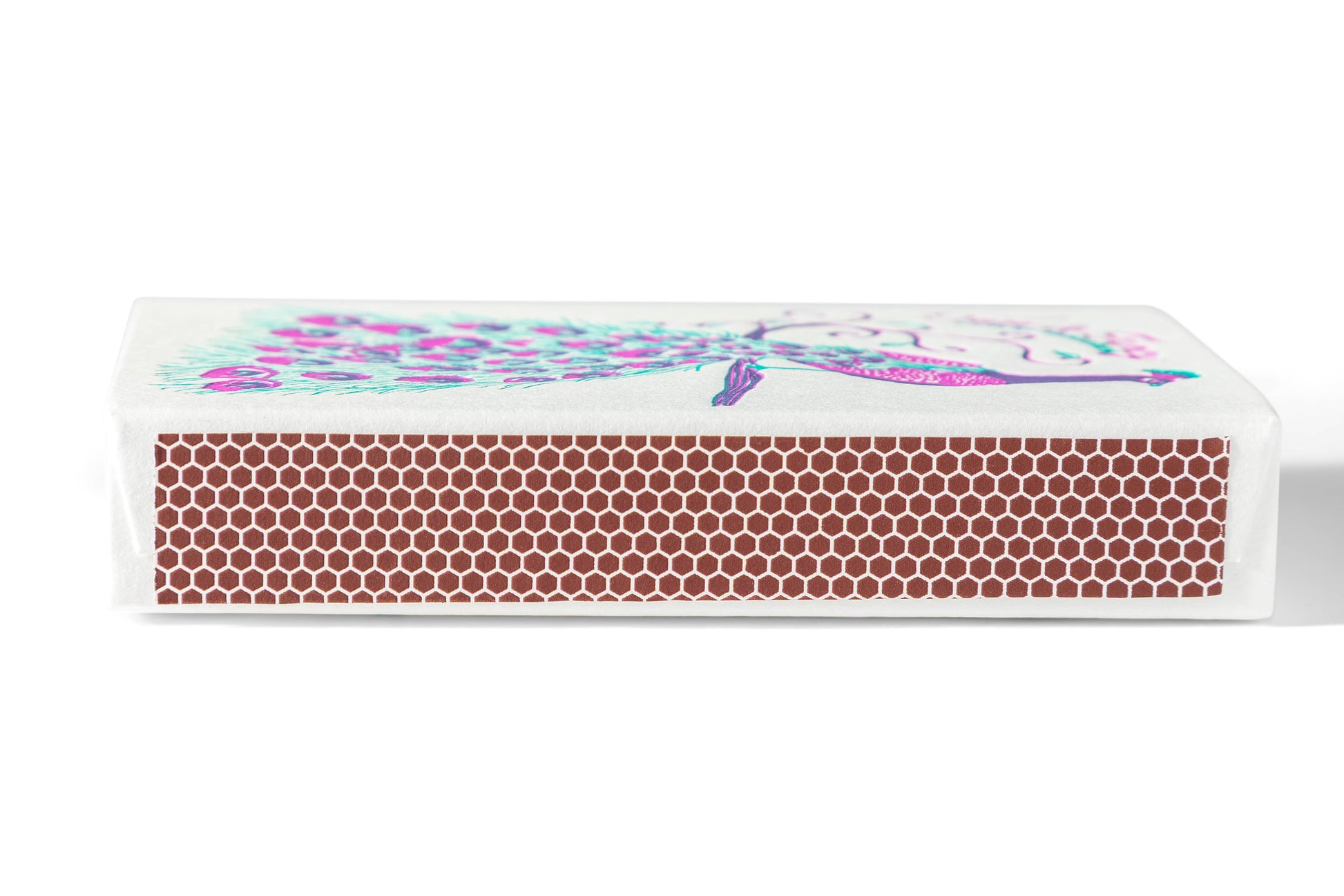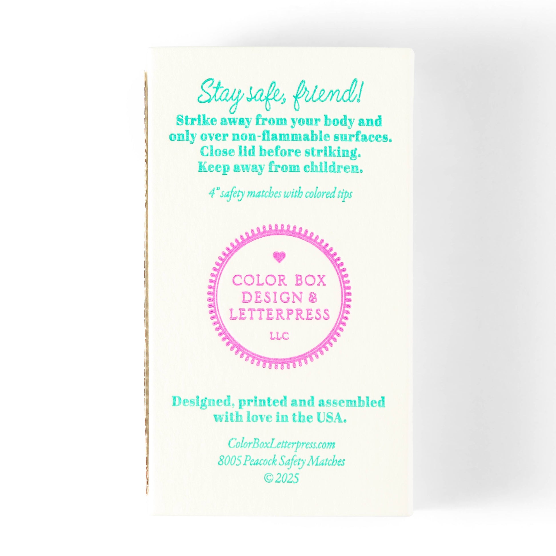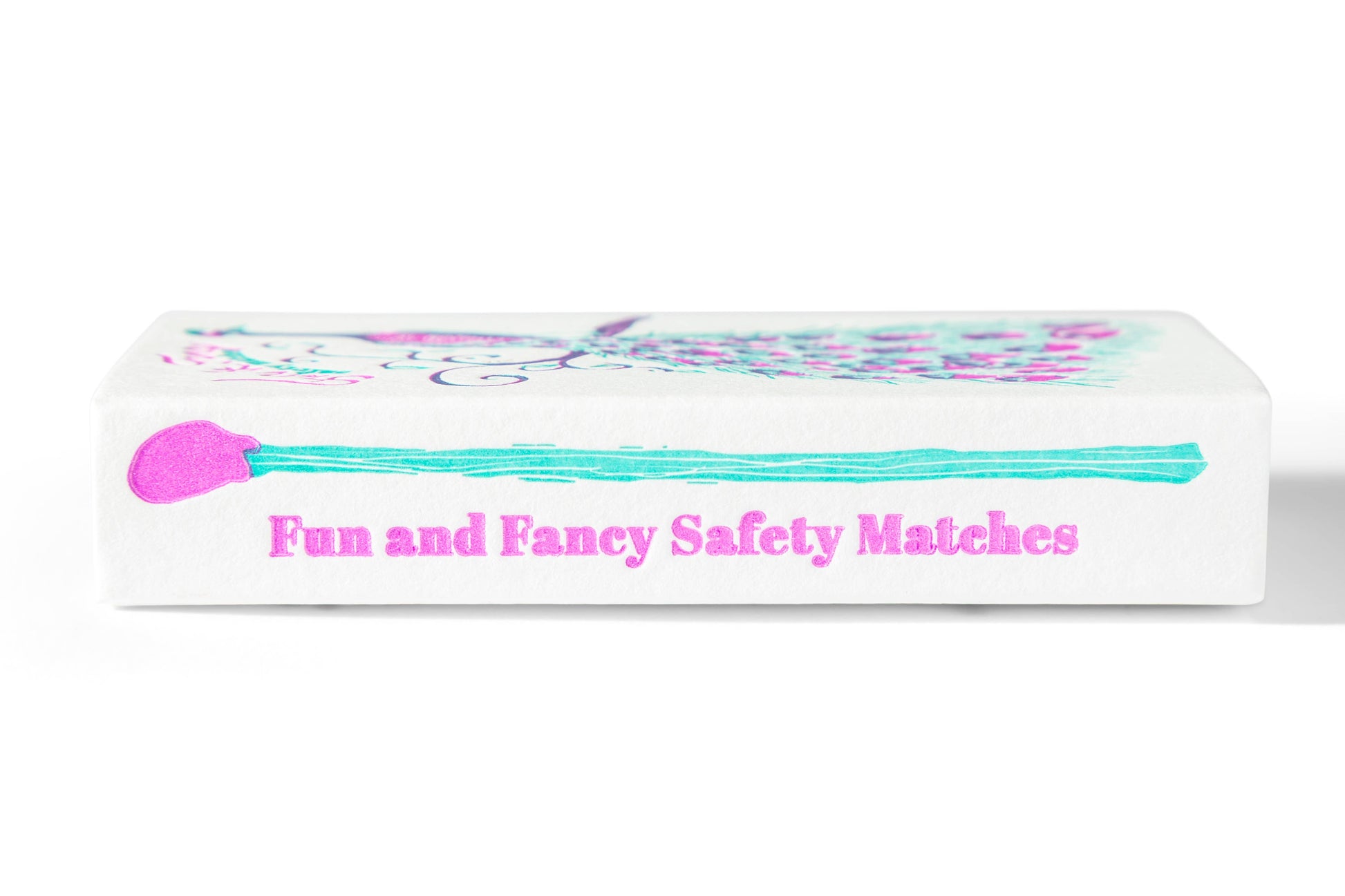 Graceful, vibrant, and a little bit glam—this peacock matchbox brings the drama in the best way. With swooping feathers and bold colors in purple, pink, and teal, it’s letterpress printed for a luxe, textured feel that turns even a simple spark into a moment of flair.